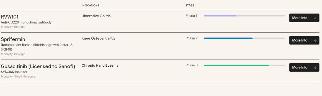 一方面,公司从研究机构、biotech和大型药企那里收购、合作或授权临床阶段的资产并推进研发。Formation Bio从Asana BioSciences和德国默克购入了三条临床管线,包括用于治疗慢性手湿疹的SYK/JAK抑制剂gusacitinib、治疗特应性皮炎造成的瘙痒的钠通道阻断剂ASN008以及治疗膝关节骨关节炎的FGF18药物sprifermin。