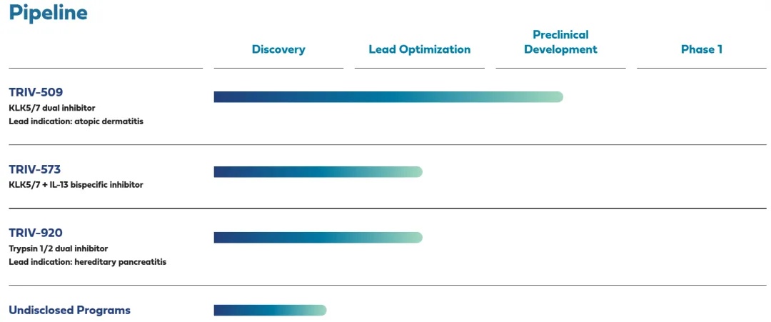 TRIV-509:一款靶向激肽释放酶5和7(KLK5/7)的单克隆抗体抑制剂,两种酶均与皮肤屏障功能障碍相关,患有特应性皮炎的人会出现KLK5/7失调的情况。在多种临床前特应性皮炎模型中,TRIV-509疗效优于IL-4R抑制剂,公司计划2025年第一季度提交研究性新药(IND)申请;
