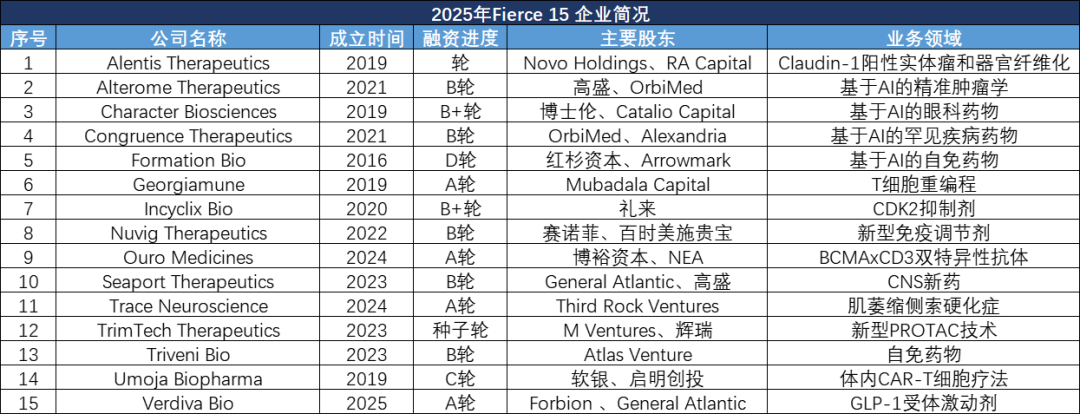 2025年9月,蜚声全球的Fierce Biotech’s 2025 Fierce 15入选药企名单公布。每年的Fierce 15企业,都暗含着对未来几年医药创新方向的预测,一些成长性较高的创新药企,例如Juno、MyoKardia、CRISPR Therapeutics等都曾是Fierce 15的入选企业,从今年的Fierce 15的名单中,透露出以下重要的方向: