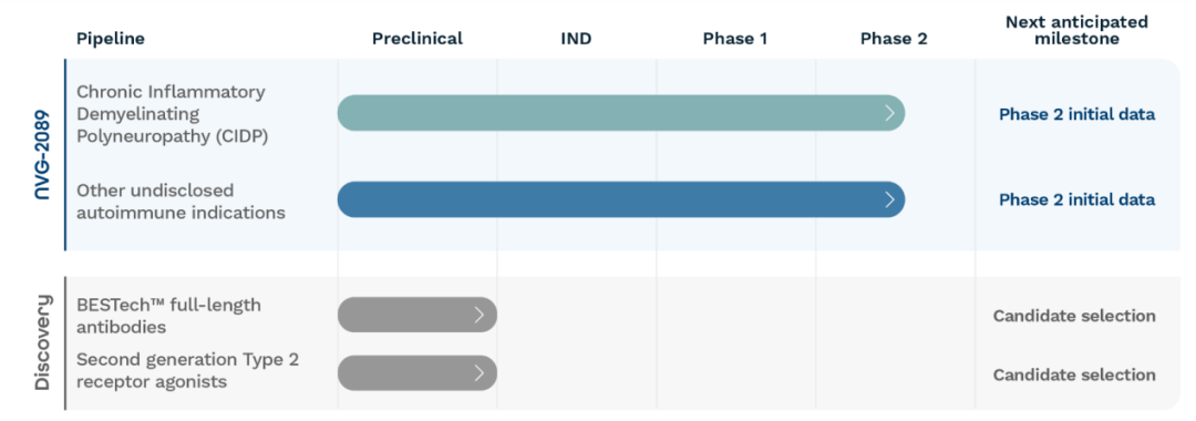 NVG-2089的1期研究中的给药已成功完成。在1期单次递增剂量(SAD)和多次递增剂量(MAD)研究中,NVG-2089是安全且耐受良好的。目前,NVG-2089 已进入Nuvig的2期临床开发规划,用于治疗CIDP和其他未公开的适应症。美国食品药品监督管理局(FDA)已授予 NVG-2089 在治疗大疱性类天疱疮方面的快速通道资格(FTD)。