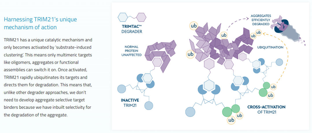 TRIMTECH的创新技术基于E3泛素连接酶TRIM21的先天特性,可选择性降解一系列疾病相关的蛋白质聚集体,而这是当前靶向蛋白降解(TPD)方法难以触及的领域。TRIMTAC降解剂分子的独特性质,有望满足治疗选择有限的大量患者群体的需求。