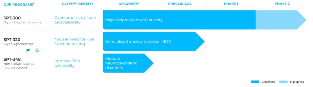 SPT-320:一款新型阿戈美拉汀前药,目前正在用于治疗广泛性焦虑症,有可能成为数十年来治疗GAD的首个新机制。利用Glyph平台技术,SPT-320绕过肝脏的首过代谢,有潜力降低其有效剂量、减少肝脏暴露,降低对肝功能监测的需求,而这正是限制阿戈美拉汀使用的瓶颈,计划于2025年上半年进入人体测试;