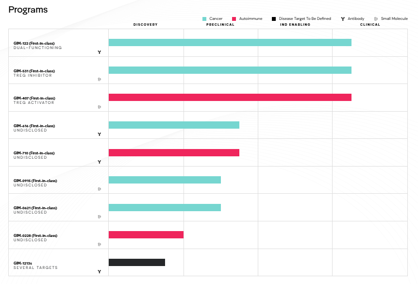 GIM-531:针对实体瘤,通过抑制Treg活性增强机体抗肿瘤免疫,现正开展单药及联合抗PD-1抗体的临床研究;