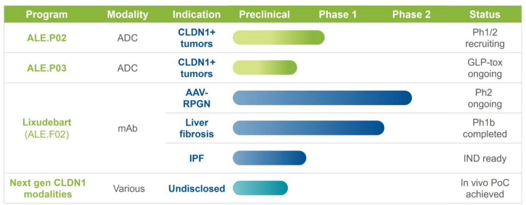 ALE.P02与ALE.P03:这两款产品为针对CLDN1阳性肿瘤的抗体偶联药物。ALE.P02正计划在CLDN1阳性鳞状细胞实体瘤患者中开展首次人体临床试验,而ALE.P03的GLP毒理学研究正在进行中;