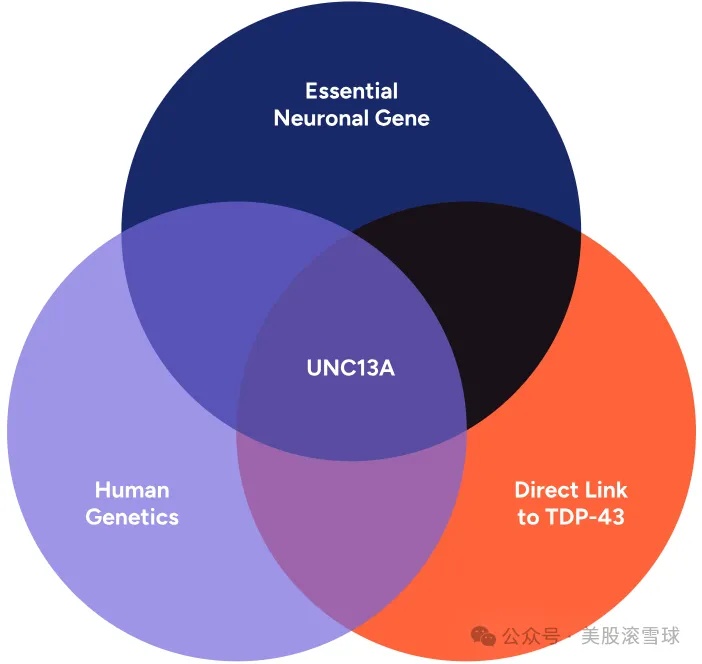 Trace Neuroscience的创始人发现TDP-43蛋白的异常功能与UNC13A蛋白的缺失有关,而UNC13A蛋白是大脑和脊髓神经元交流的重要组成部分。约97%的ALS患者产生的UNC13A蛋白不足,而该蛋白直接受控于调节RNA剪接的TDP-43蛋白。当TDP-43无法正常工作时,编码UNC13A的mRNA被异常剪接,阻碍了UNC13A的产生。