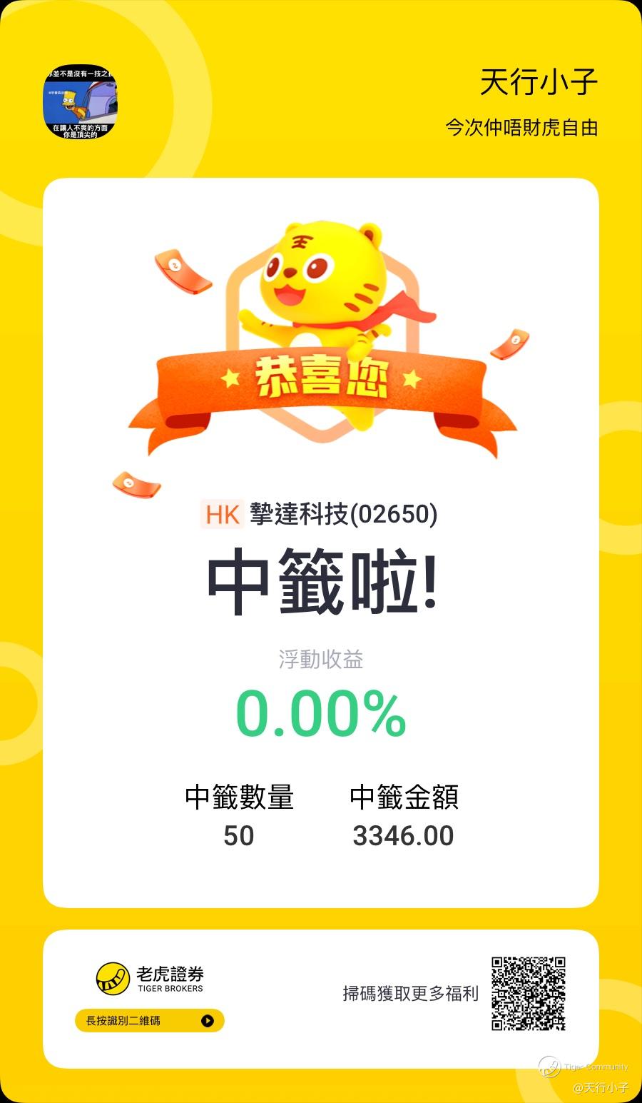 $挚达科技(02650)$ 希望明天暗盘有长假之后的一个好开始。当然我相信另一只创业板可能升幅会比较多,希望新股热潮继续炽热落去,大家都可以赚返一笔