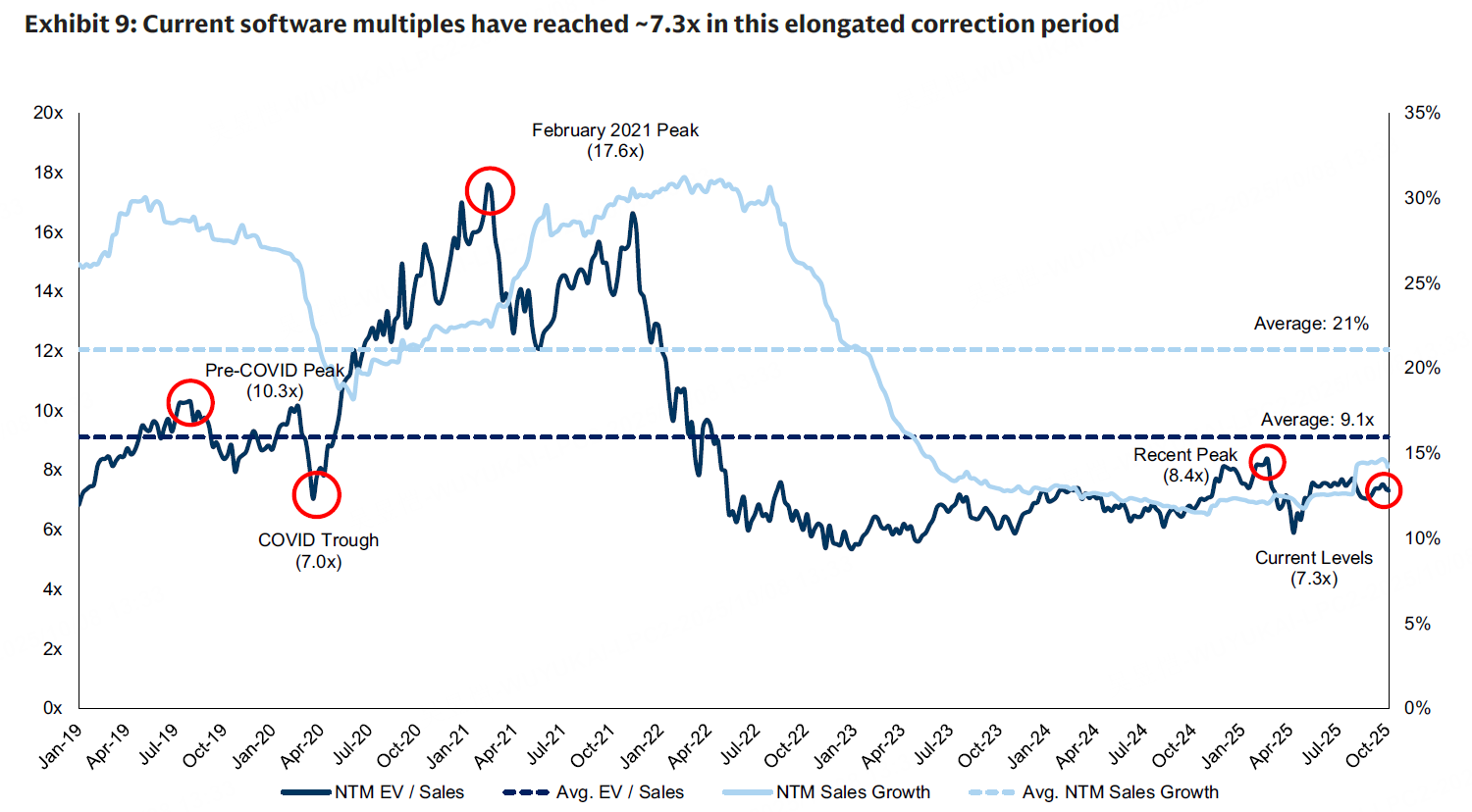 当前的市场似“理性繁荣”,软件的倍数达低谷时期的7.3倍,修正期~7.6月。监控采用、支出与影响,但无崩盘迹象。核心持仓NVDA、GOOG,辅能源标的。焦点是有ROI公司。若2026广告起效,将重塑市场,否则警惕周期修正。