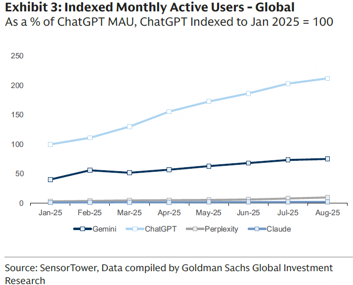 用户行为正逐步精进。人们更偏好“咨询式”互动,如历史查询,这暗示AI或侵蚀传统搜索份额。平台差异化显现:ChatGPT侧重非职场场景(约70%),Claude擅长编程(36%)。SensorTower数据显示,ChatGPT在全球及美国月活、日活中领先,Gemini次之,Perplexity与Claude增长稳健。