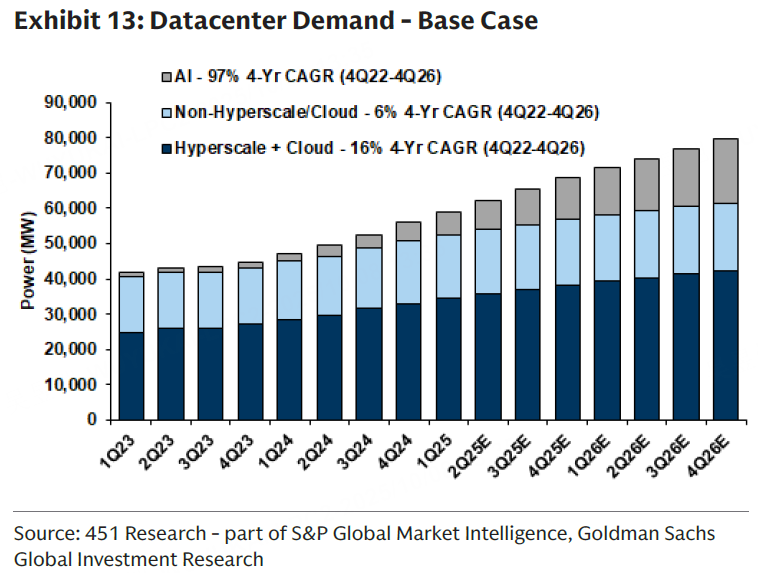 能源瓶颈突出。高盛数据中心团队预测,超大规模玩家2025-2027支出1.4万亿。AI负载将推数据中心电力需求到2030增长165%,相当于新增前10大耗电国。全球需求2025 Q2为62GW(AI占13%),2027达92GW(AI占28%),2030在线容量137GW。 $Oklo Inc.(OKLO)$
