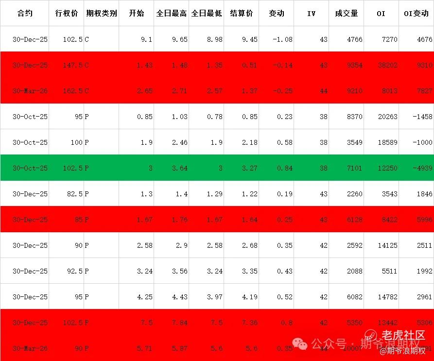 (3)美团:10月最大持仓范围95-120,窝轮牛熊街货分布90-115,今收103.7,下跌1.80%。期权盘路变化超过1000张的仓位如下,红色是增仓较大的,绿色是减仓较大的。比起以往,最近几个月美团的增仓都是巨大的,但是!富婆跟了几次做买方,都变成了敢死队死在了沙滩上。我复盘了一下,还是外卖大战没分出胜负,美团窄幅下跌,波幅窄,买方自然归零的快。比起腾讯、阿里和宁德,美团近期还是太弱了,有对冲和备兑的卖方可以,买方只能是炮灰。