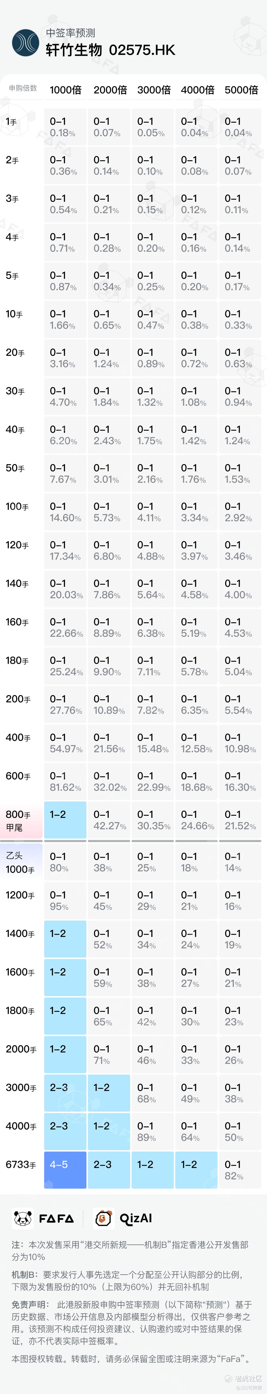 轩竹生物-B本次发行采用机制B,回拨10%。公开发售673.335万股,每手500股,共计13466手,甲乙各6733手,又是抽奖时刻。当前孖展是超1800倍,预计最终热度会到3500倍;有基石,无绿鞋,由中金独家保荐,近两年保荐的项目首日上涨率达60%。参考近期上市的长风药业暗盘表现——较招股价飙升227%,一手赚16775元,以及采用机制B的同类型公司上市首日均有不错表现,预计轩竹生物暗盘及首日可能有80%以上涨幅。