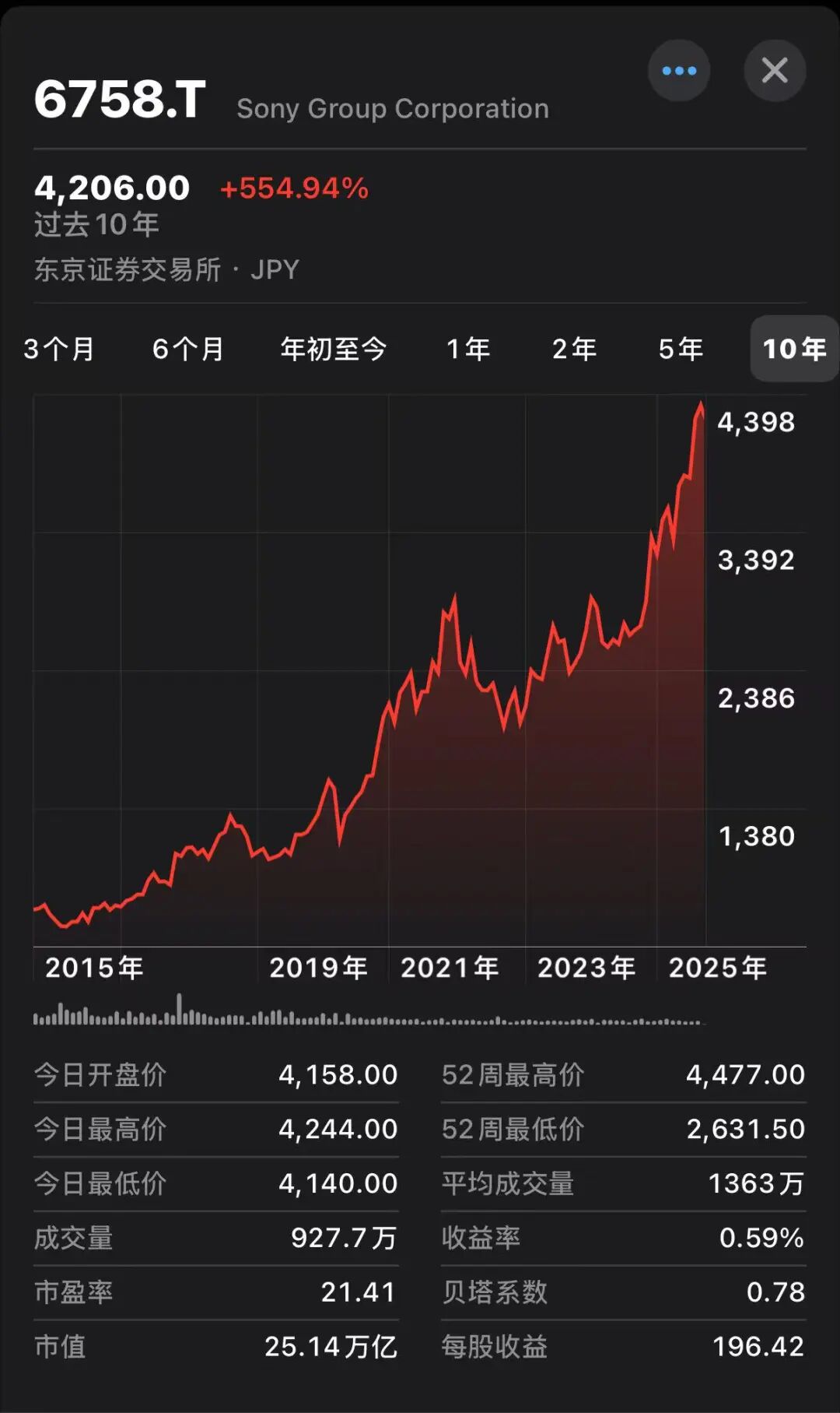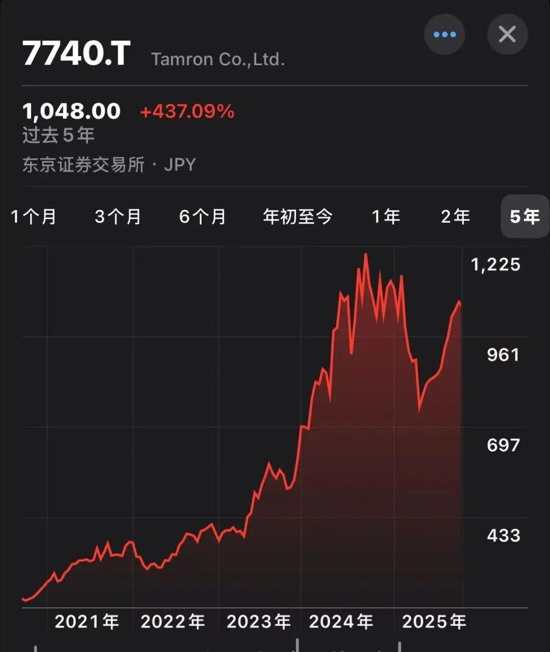索尼的战略虽然看起来损失了一部分利润率更高的镜头收入,但是“开源”的战略让本身在镜头群上处于劣势的索尼一下子镜头数量爆表,一般相机厂商一年就开发3-4款新的镜头,佳能因为长时间在相机领域的深耕积累了庞大的“镜头群”,索尼如果自己研发永远也无法超过佳能。但是索尼开放生态之后,腾龙、适马、蔡司和大量的国产镜头厂商开始以每家每年4-5款速度为索尼开发镜头,索尼一下子从镜头群劣势到镜头数量和质量吊打佳能和尼康,虽然仍然有人诟病索尼的画面色彩不如佳能,但很快索尼便成为了摄影人士尤其是摄影小白的首选,就是因为丰富和相对便宜的镜头选择(当然还有对焦的研发,这个就不展开了)。而因为索尼市占率的提升,镜头厂商一定会发布新研发镜头的索尼卡口版本,形成了网络效应一样的正反馈。而跟着索尼混的小弟,日本镜头厂商——腾龙镜头(Tamron)也因为索尼的市占率提升,也在过去五年涨了超过四倍(这也是在摄影领域可以发现的第二个大牛股)