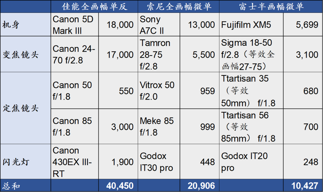 我做了一个简单的对比,除了相机机身,都搭配一个常用焦段(24-75mm)变焦镜头,一个等效50和85mm焦段定焦镜头加一个闪光灯,在早期佳能全部原厂配件到索尼微单时期用副厂变焦和国产定焦,到半画幅富士相机同样搭配,可以看出从佳能时代差不多要40000人民币到Sony已经降低了快一半,而使用便宜的半画幅富士相机就差不多10000人民币,已经是大部分人能够负担的起,而不需要穷三代了。而佳能价格是大概5-10年前的价格,考虑通胀,价格下降幅度只会更大。