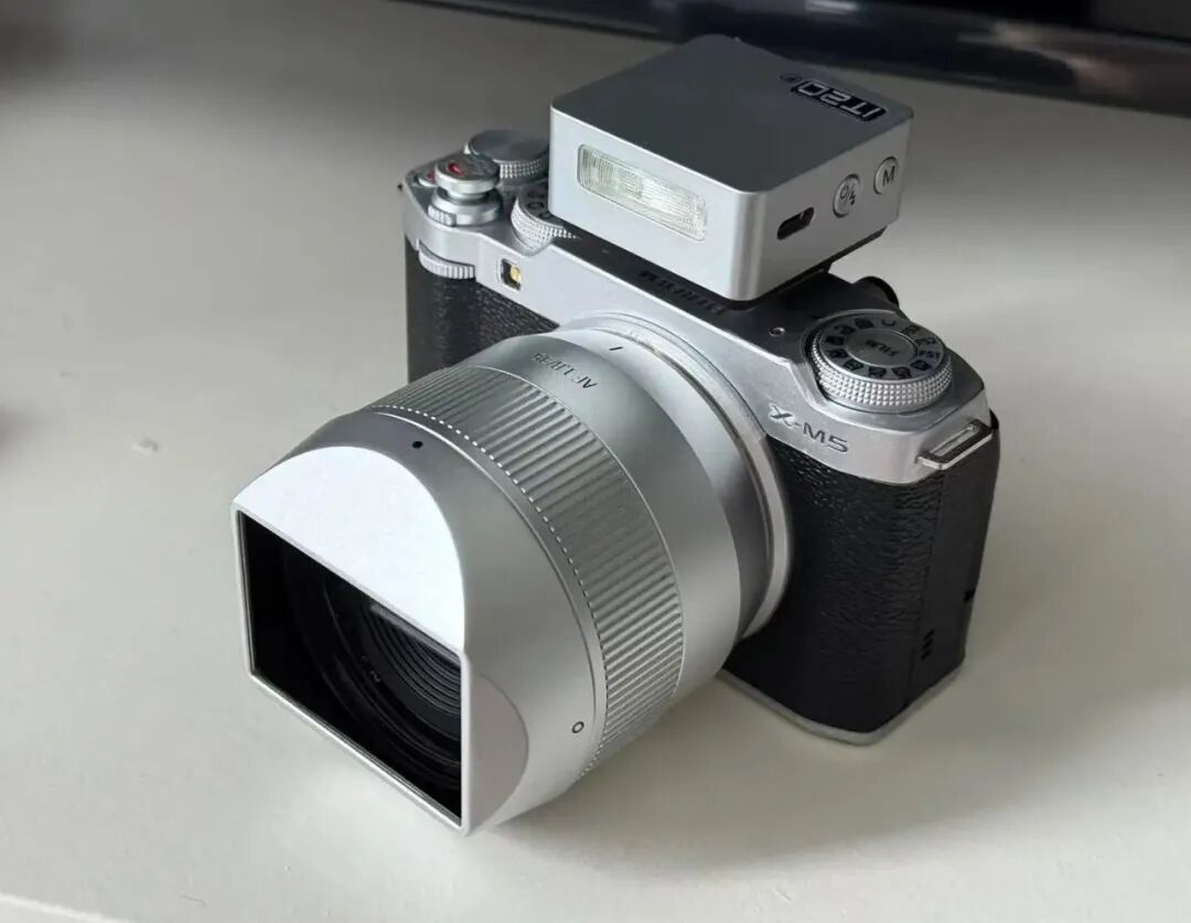 从此,大部分的定焦镜头都只够买国产的镜头了,特别在我买了我的富士相机之后我发现,国产镜头不光是价格便宜,也开始在轻量化和颜值上做了很多文章。尤其对于富士这种以颜值著称的相机而言,国产厂商开发了大量配合相机颜色的镜头,比如好看的银色和白色镜头,配合上富士相机效果拉满(比如下面这个图)。与此同时,也非常的轻便,很多就不到200g重量,搭配上富士的300g的机身,机身+镜头总体总量不到500g,和索尼的全画幅相机机身重量差不多,再次让相机在便携性上更进一步。