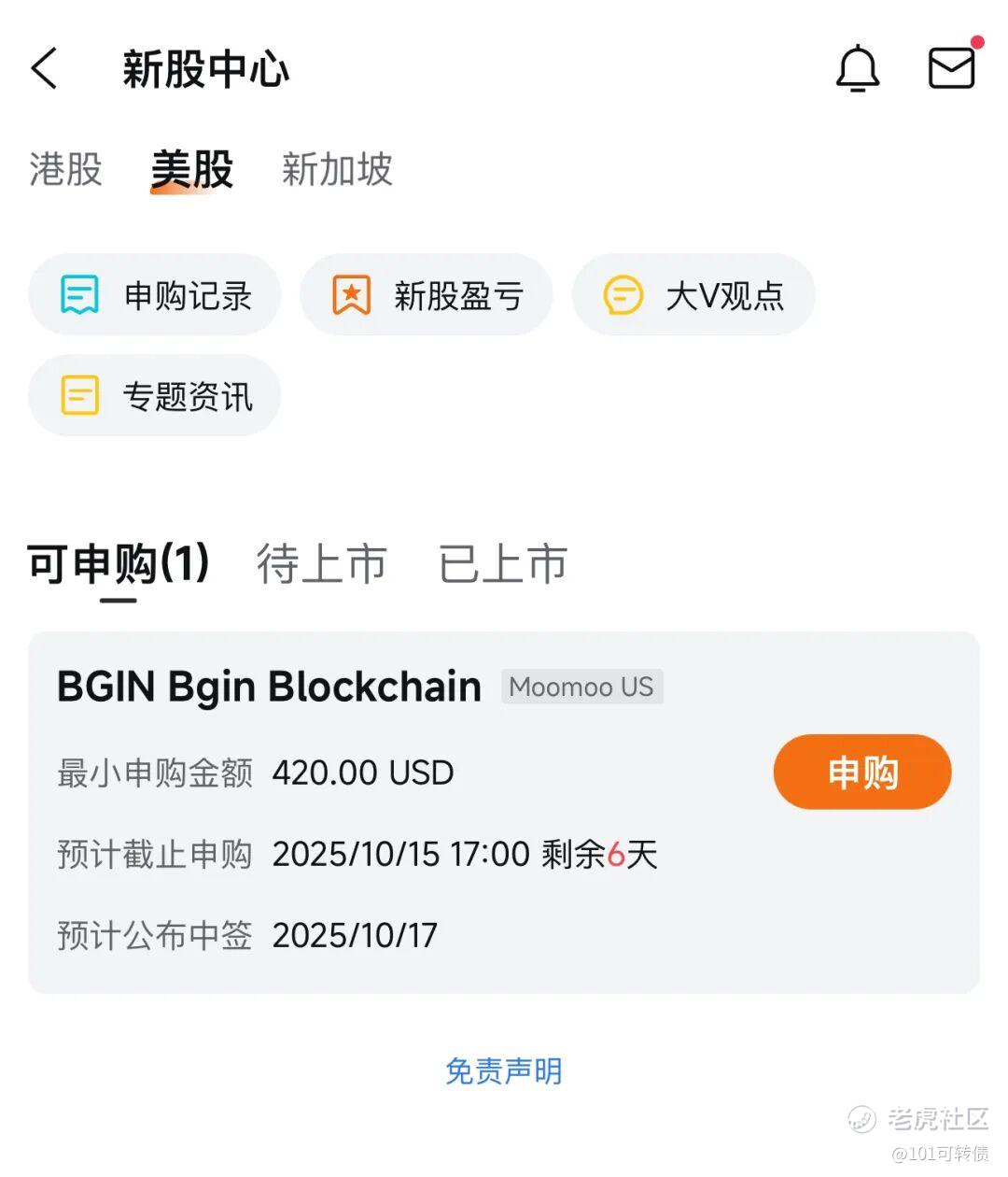目前支持BGIN美股打新的主要券商:富途证券。申购流程:新股申购--美股--申购金额/申购数量--提交。美股打新无需市值要求,也不需要缴纳手续费。