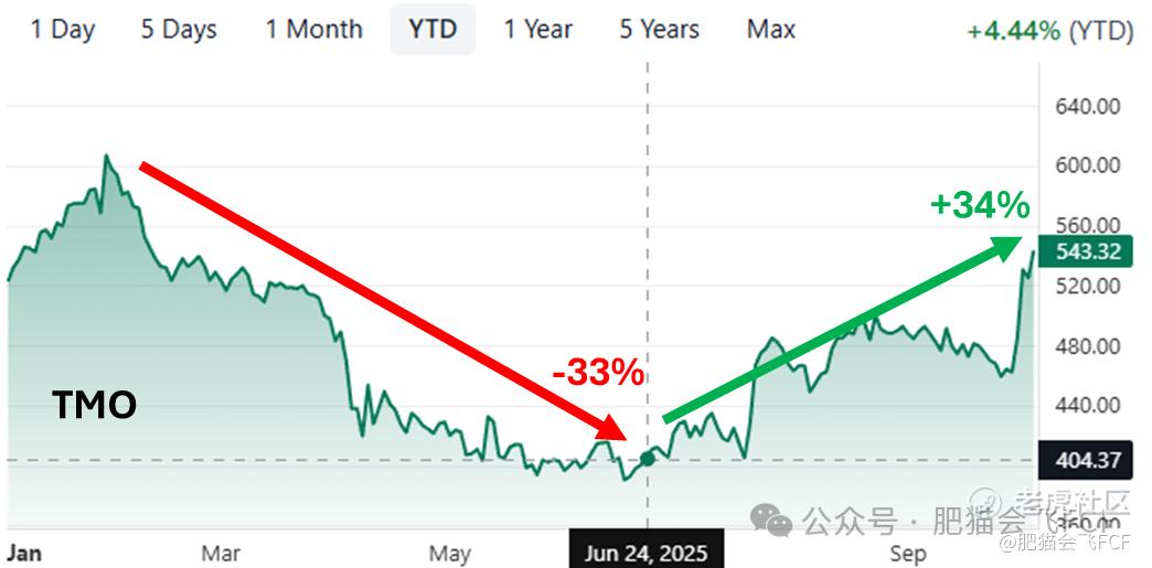 尽管此前TMO从最高点下跌超过30%,同时网上关于TMO的分析文章和视频屈指可数,但如果你用肥猫的分析框架,就能够在市场冷门处发现机会,在热门股票之外找到真正的“黄金坑“。在此恭喜那些从TMO股票上获利的朋友们!