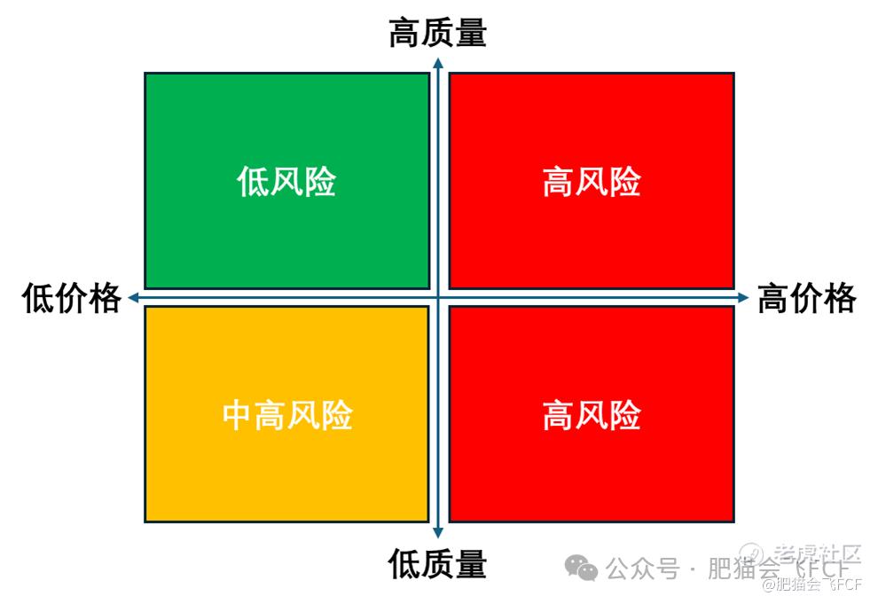 因此,投资中最重要的,不仅是资产本身的质量,更关键的是你为它支付的价格。价格决定风险,这是一条被很多人忽视的铁律。如同下图所示,在右半象限中,无论资产优质与否,只要价格被推得太高,就天然带着更大的风险;而在左上象限,高质量、低价格的组合,才是真正意义上的“低风险投资”。