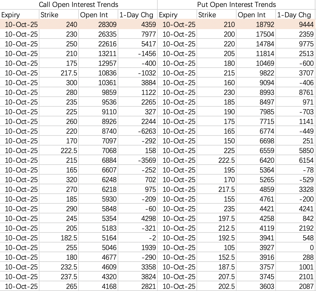 看跌期权在210~220之间纠结,sell put可以考虑此区间之下 $AMD 20251017 210.0 PUT$