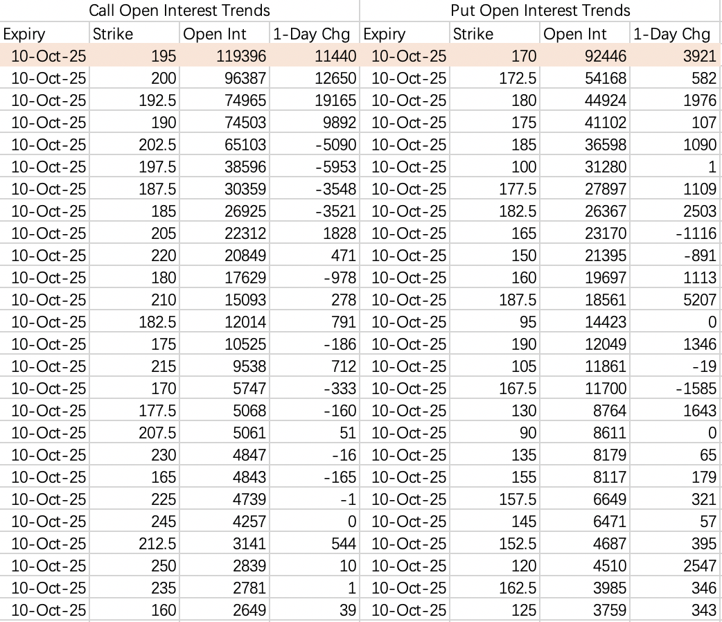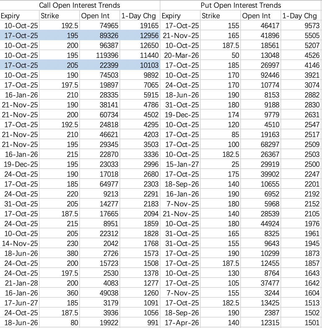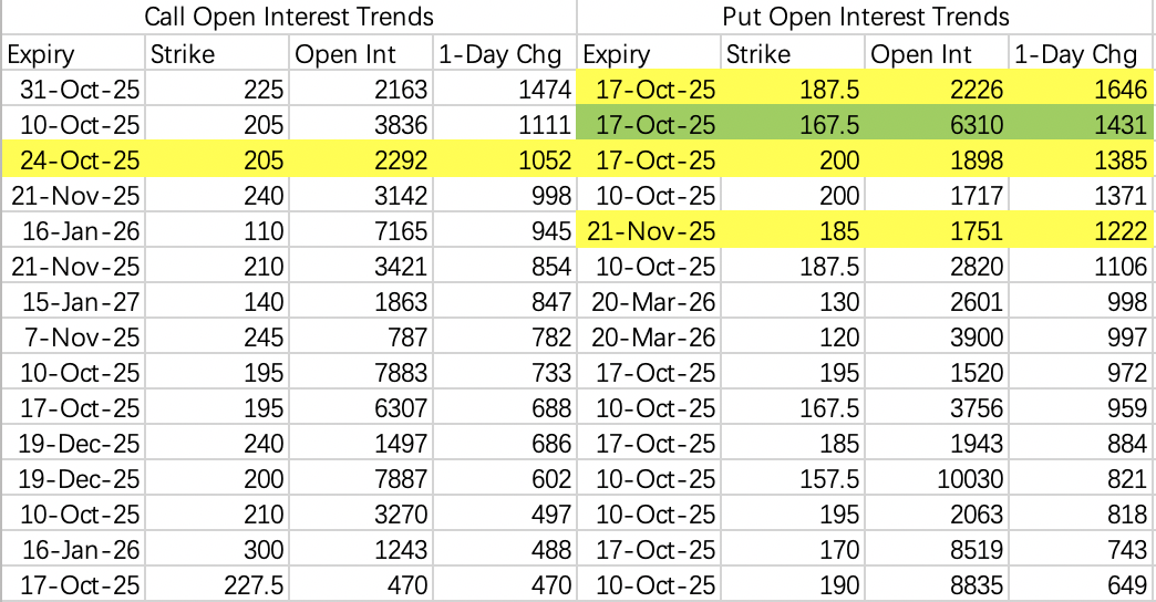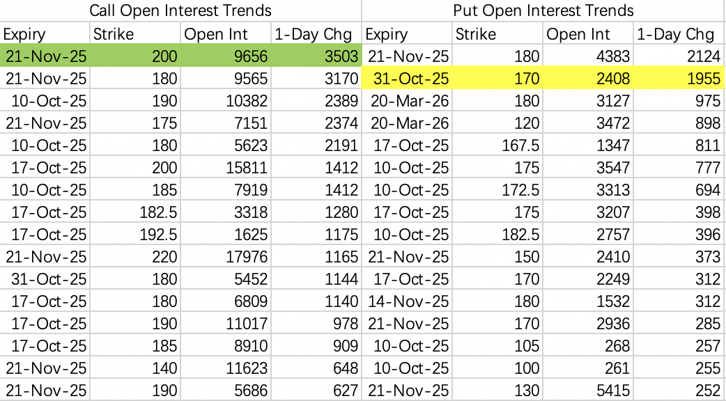 看跌期权做空很积极,不过回调预期幅度不大,近期震荡可以考虑sell put 180 $MU 20251017 180.0 PUT$