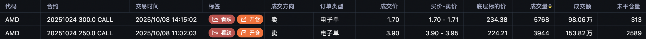 sell call 300$AMD 20251024 300.0 CALL$ ,开仓1.24万手。