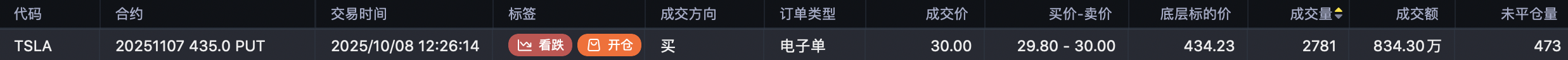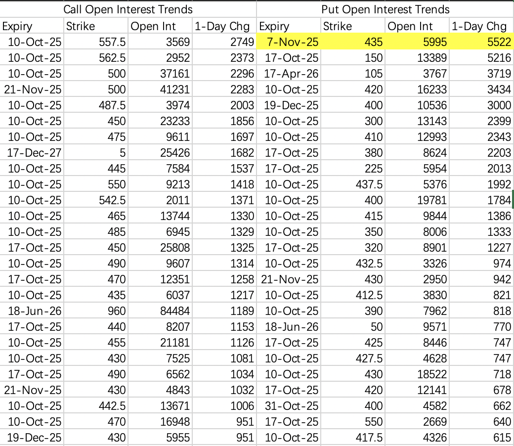 特斯拉股价回调到435以下,有人开仓买入11月7日到期435put $TSLA 20251107 435.0 PUT$ ,开仓5522手,估算成交额得有1500万。
