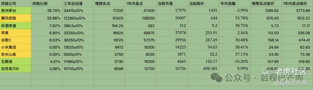 目前十大持仓:贵州茅台39%,腾讯34%,珍酒李渡7%,苹果7%,谷歌6%,五粮液4%,伯克希尔3%。目前九大持仓占比88%(其中科技股占比47%,白酒股占比50%;A股占比43%,港股占比41%,美股占比16%),还有12%观察仓和现金。