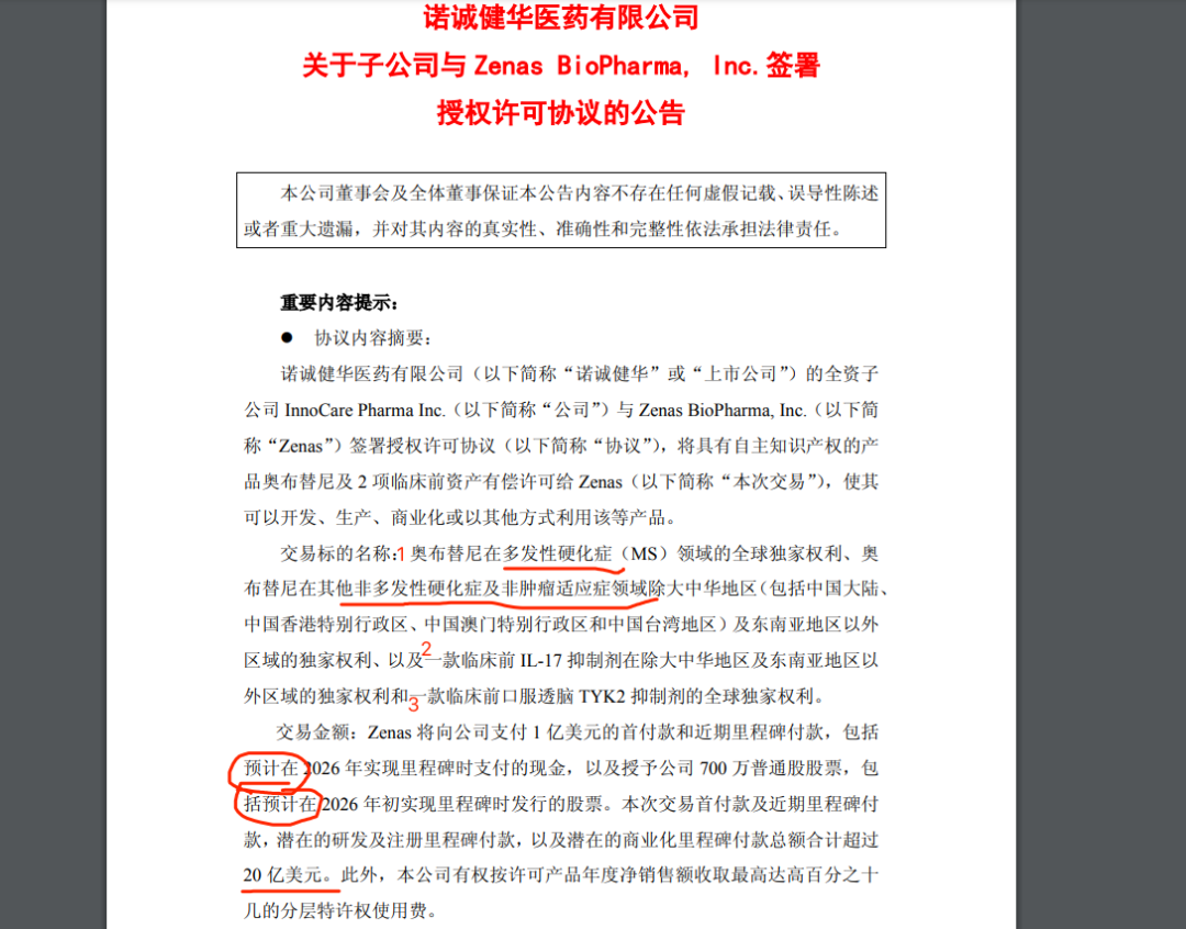 就在昨天,诺诚健华宣布,与与海外生物药企Zenas BioPharma签署授权许可协议,将处于临床Ⅲ期阶段的BTK抑制剂奥布替尼在多发性硬化(MS)领域的全球独家权利、奥布替尼在非肿瘤的其他治疗领域的大中华及东南亚以外区域的权利,以及IL-17 抑制剂、口服透脑的TYK2抑制剂两款临床前产品的全球权益授权给Zenas。