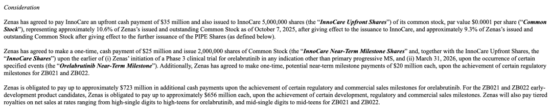 2)在付款的节点上表述太过于鸡贼,“1亿美元的首付款和近期里程碑付款”,公告根本没法分清。翻开Zenas美股公告,实际的首付款现金部分只有3500万美元,但拿到首付款的同时拿到500万股的股票,这些才是签约就可拿到手的。达到临床3期里程碑后再拿到2500万美元+200万股股票。后面的钱将在监管里程碑和销售里程碑拿到。