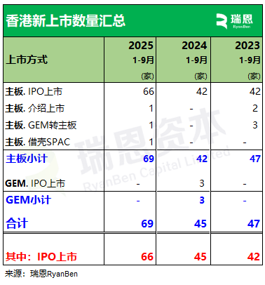 2025年前三季度香港新上市公司共69家(2024年45家、2023年47家),全部来自主板,其中66家通过IPO方式上市、1家介绍上市、1家通过借壳SPAC上市、1家GEM转主板上市。