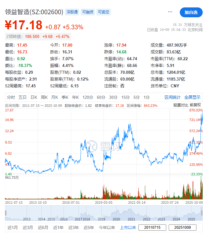 领益智造(002600.SZ)于2011年7月15日在深交所上市,截至周四(10月9日)市值逾1,204亿元人民币。