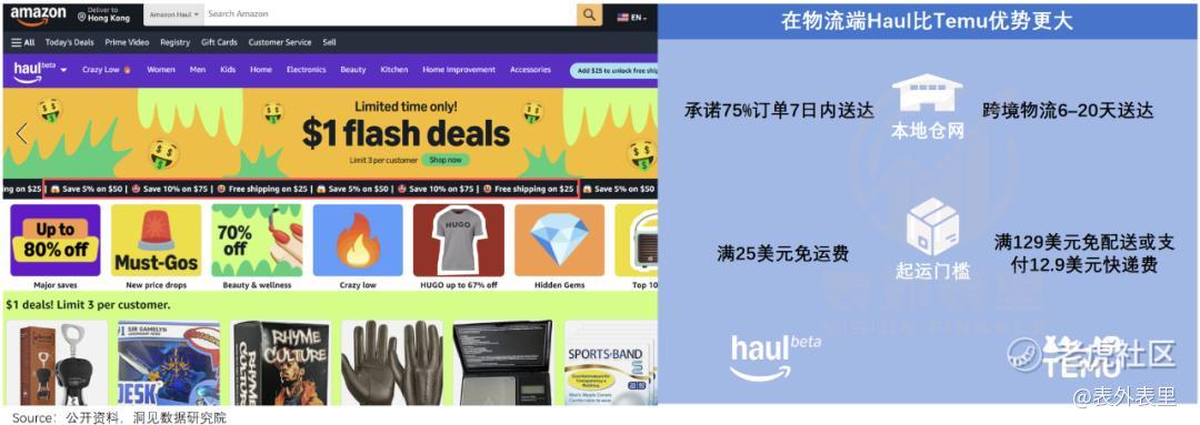 Temu自诞生伊始,面对的就是一片红海混战,亚马逊、速卖通们不可能坐视其强大。拿亚马逊低价商城Haul来说,“1美元热卖专区”“3美元以下商品无权退货”等策略针对性拉满;且土生土长的Haul,物流也更有性价比。