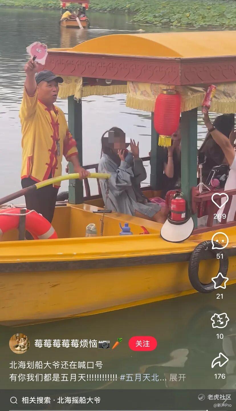 除了在著名景点投放五月天的IP装置「五球」(五月天乐团25周年巡回演唱会的标志性艺术装置,五个色彩不同的球代表五个成员),北京还为五月天粉丝准备了打卡路线。在「痛城」的氛围之下,粉丝成为城市文旅宣传的自来水,一位歌迷拍摄了北海开船大爷大喊「我们是五月天」并唱起《OAOA》的视频,这些UGC内容借助鲜活的人,让北京文旅呈现出更有趣的一面。