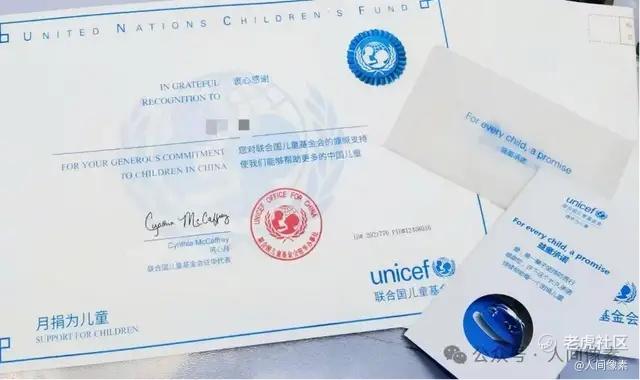 「静姝每月捐款,联合国儿童基金会为静姝寄来的感谢信和纪念品」