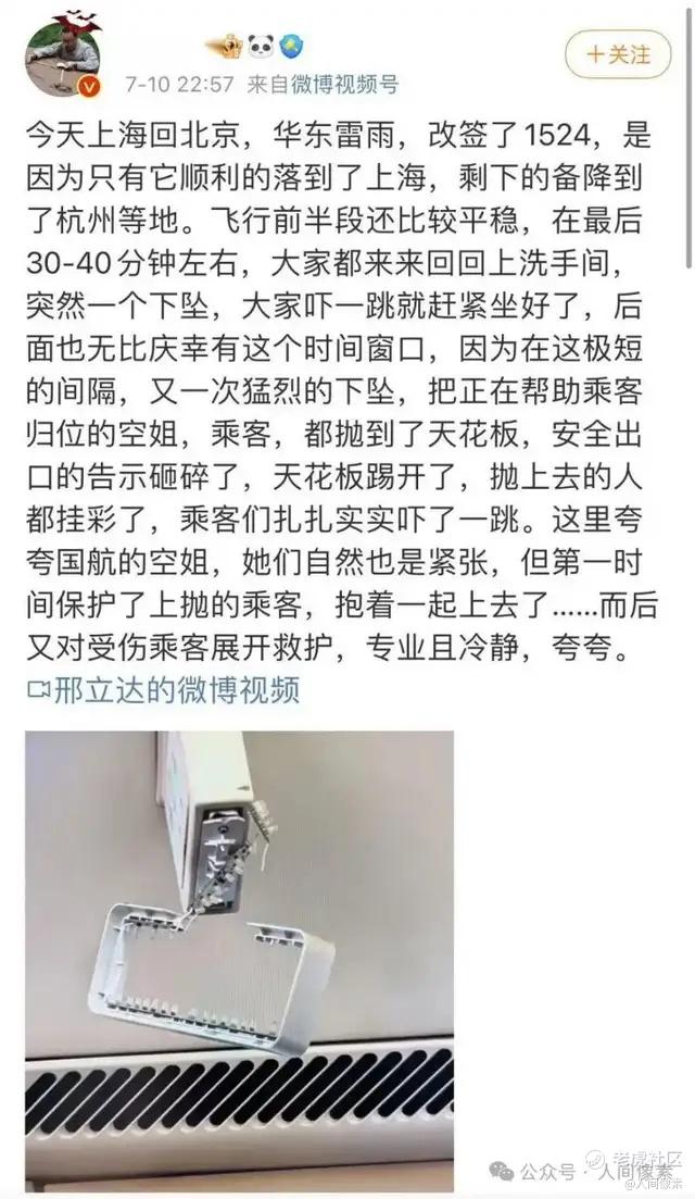 2023 年 7 月 10 日,中国国际航空 CA1524 航班(上海虹桥-北京首都)在飞行途中遭遇严重晴空颠簸,空姐毫不犹豫抱住女乘客,以自己的身体为肉盾保护对方,两人一起被抛向机舱天花板,安全出口的指示灯被撞坏。