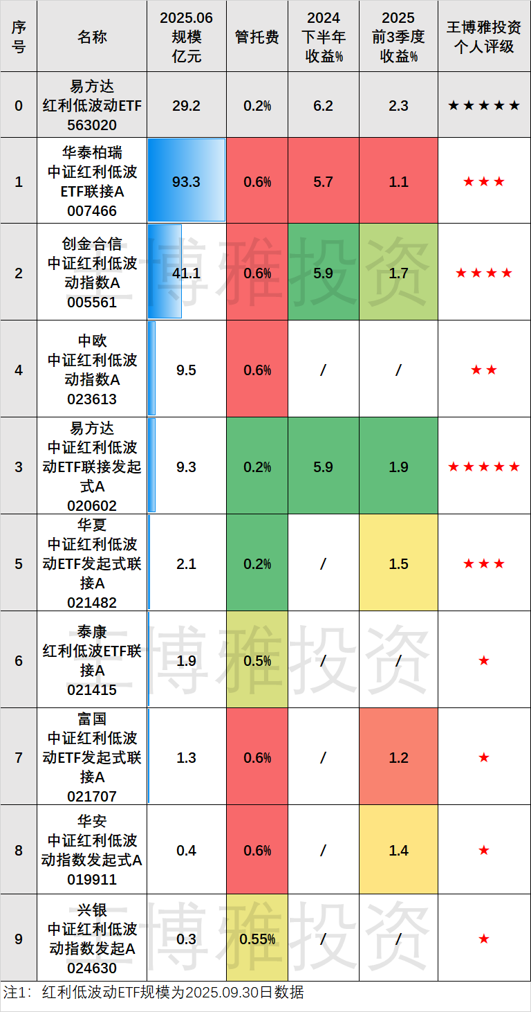 (1)易方达中证红利低波动ETF联接发起式A(020602)表现最好。考虑到易方达有着最低的综合费率以及一贯优异的管理水平,预计未来仍然表现最好。