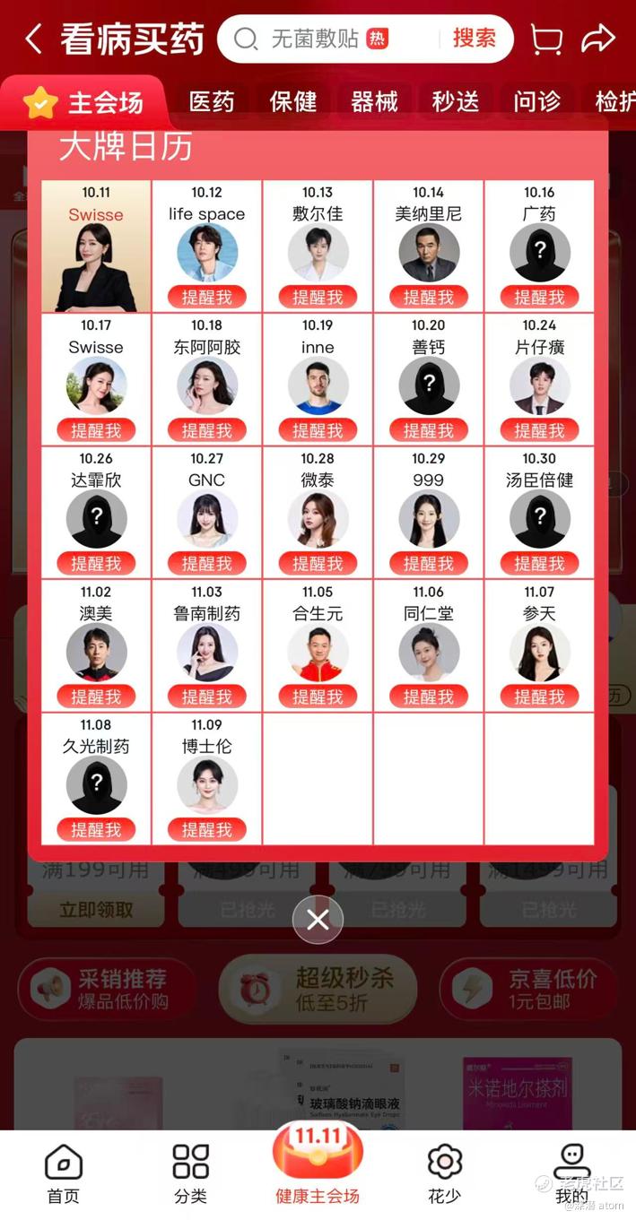 未来一周,许多明星将出现在京东买药11.11明星大牌免单阵容中。10月12日,王一博将与life space一起为消费者送上百万免单;10月13日、14日,成毅、方中信将分别为购买敷尔佳、美纳里尼品牌健康好物的消费者带来送免单惊喜。喜欢迪丽热巴和倪妮的粉丝,不要错过10月17日、18日的Swisse、东阿阿胶大牌免单日。