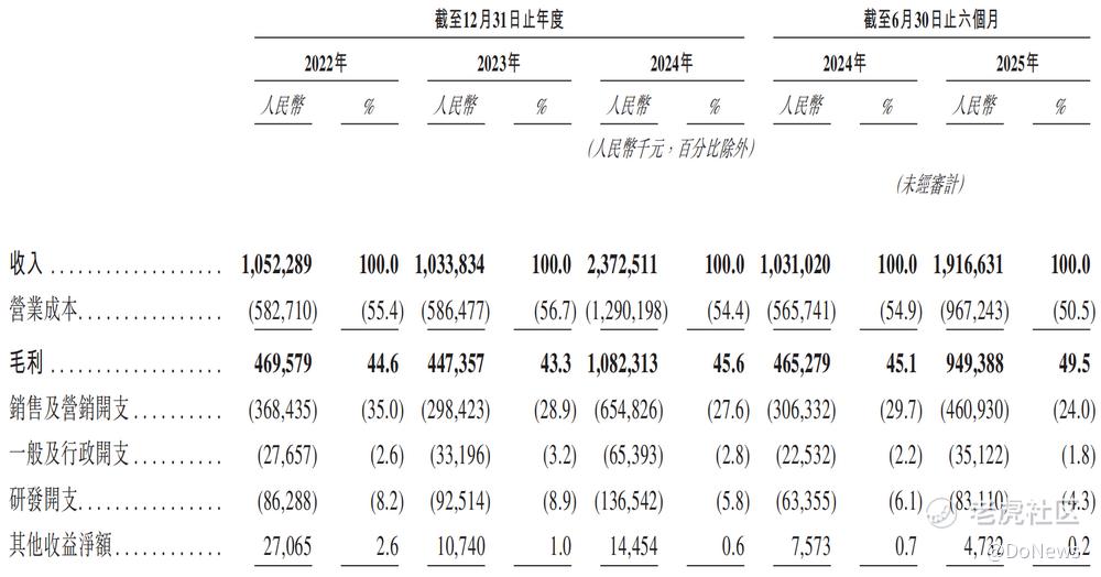 此外,2022年至2024年及2025年上半年,米连科技的销售及营销开支分别为3.68亿元、2.98亿元、6.55亿元和4.61亿元,占营收的比例分别为35.0%、28.9%、27.6%和24.0%;研发开支分别为8628.8万元、9251.4万元、1.37亿元和8311.0万元,占营收的比例分别为8.2%、8.9%、5.8%和4.3%,均表现出开支增长但占比下降的趋势,反映出运营效率的显著提升。