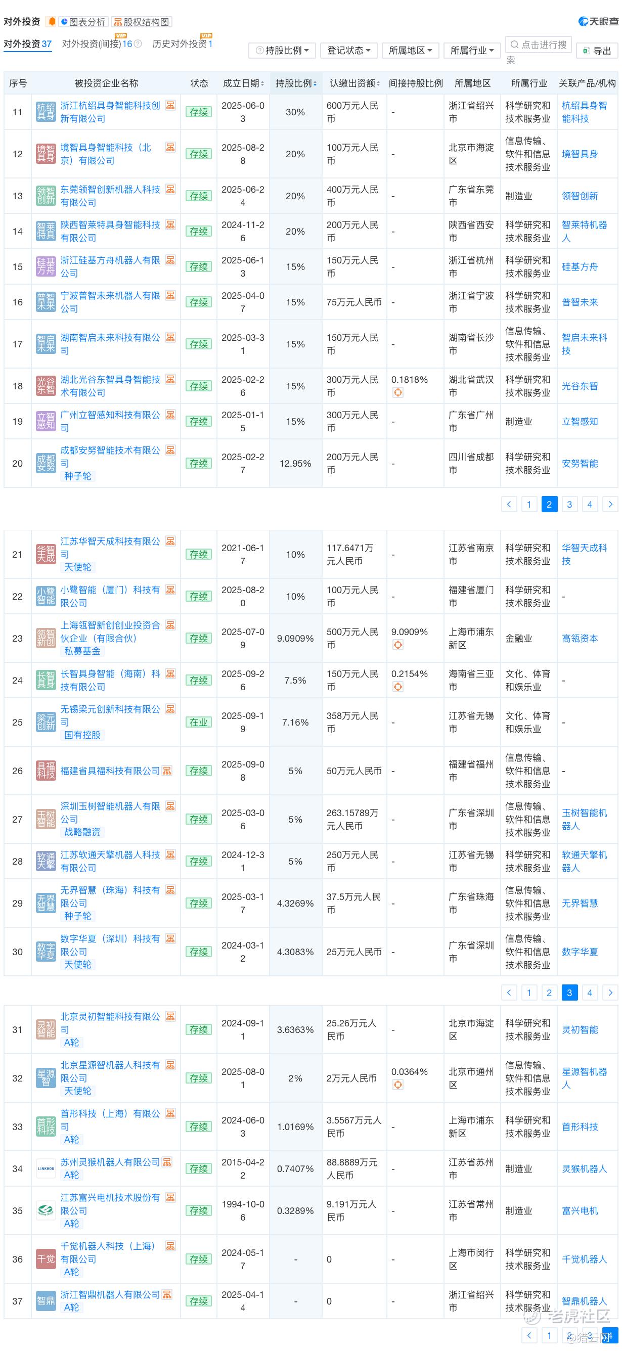 天眼查App信息显示,2024年7月至今,智元对外投资标的包括:杭绍具身智能科技、境智具身、领智创新、智莱特机器人、硅基方舟、普智未来、智启未来科技、光谷东智、立智感知、安努智能、华智天成科技、玉树智能机器人、软通天擎机器人、无界智慧、数字华夏、灵初智能、星源智机器人、首形科技、灵猴机器人、富兴电机、千觉机器人、智鼎机器人……持股比例从0.3289%-30%不等。