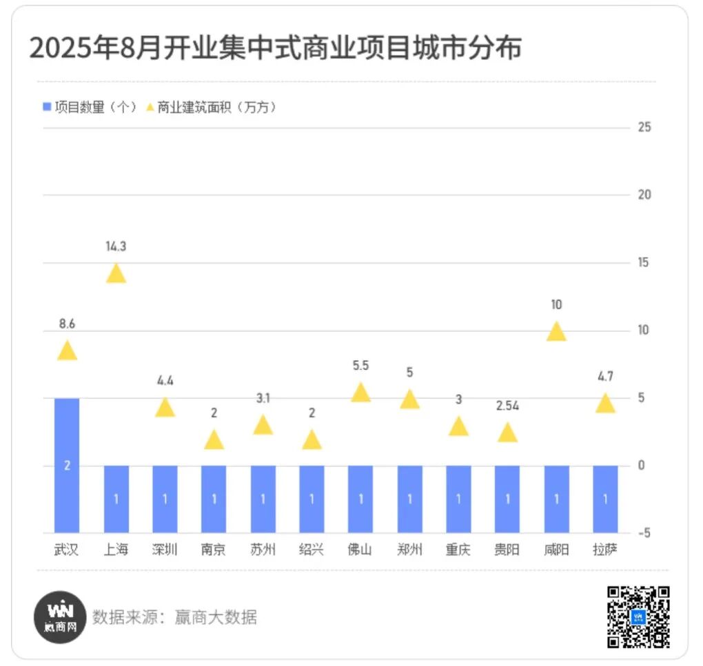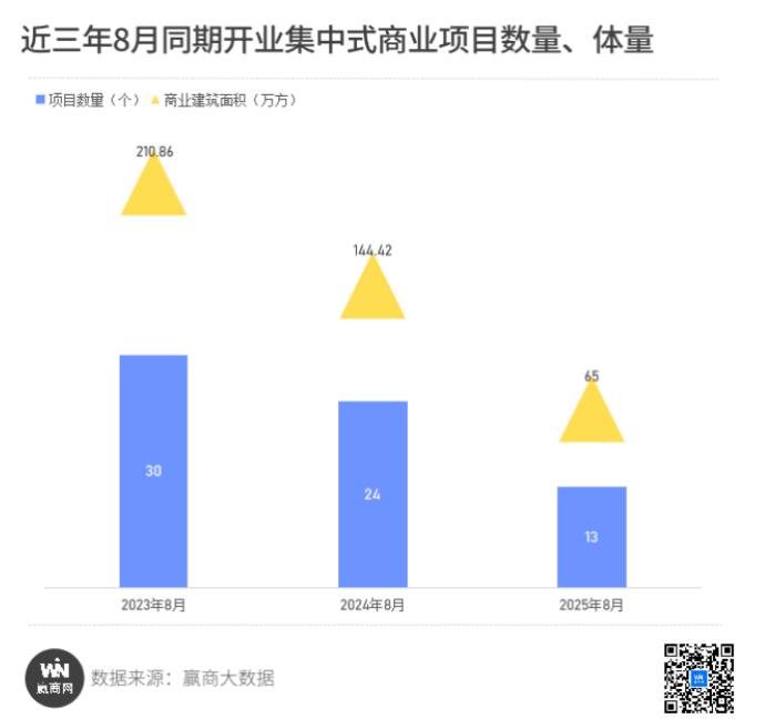 ▶ 赢商网:8月新开集中式商业项目13个,商业体量约65万平方米(同比下降55%);呈现社区/邻里商业活跃、以2~3万平方米小体量为主的特征