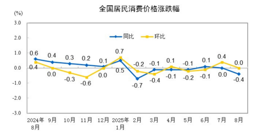 8月份,全国居民消费价格同比下降0.4%,其中,城市下降0.3%,农村下降0.6%;食品价格下降4.3%,非食品价格上涨0.5%;消费品价格下降1.0%,服务价格上涨0.6%。1-8月平均,全国居民消费价格同比下降0.1%。