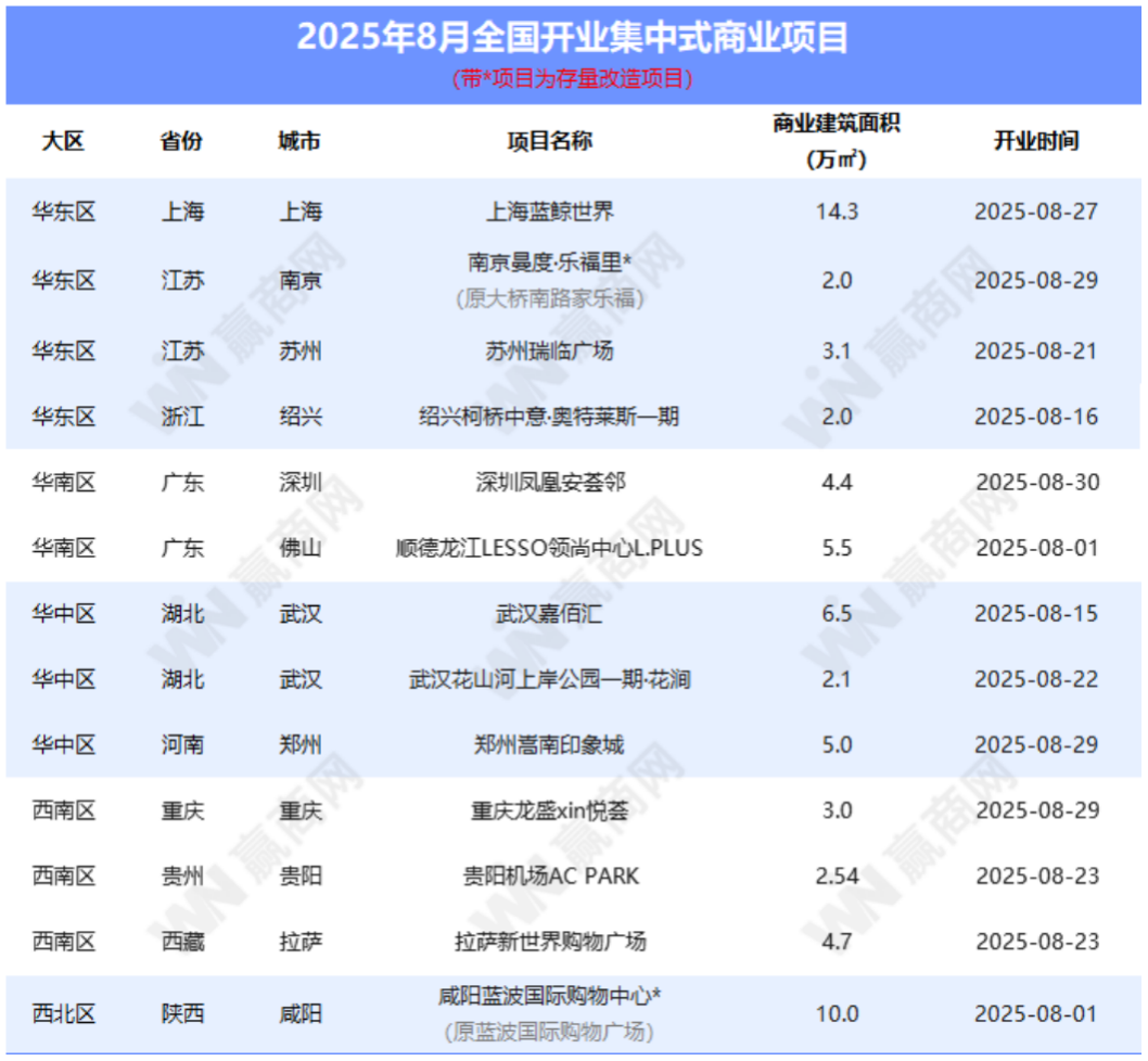 数据说明:1、统计范围为全国368个城市(不含港澳台)管辖行政区内,于2025年8月开业的集中式商业项目,项目类型包含购物中心、独立百货等;2、统计数据包含新建开业项目、存量改造开业项目、试营业项目;3、统计时间截止至2025年9月4日。