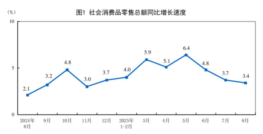 8月份,社零同比增长3.4%,增速较上月回落0.3个百分点,已经连续三个月回落;除汽车以外的消费品零售额同比增长3.7%(前值增长4.3%)。