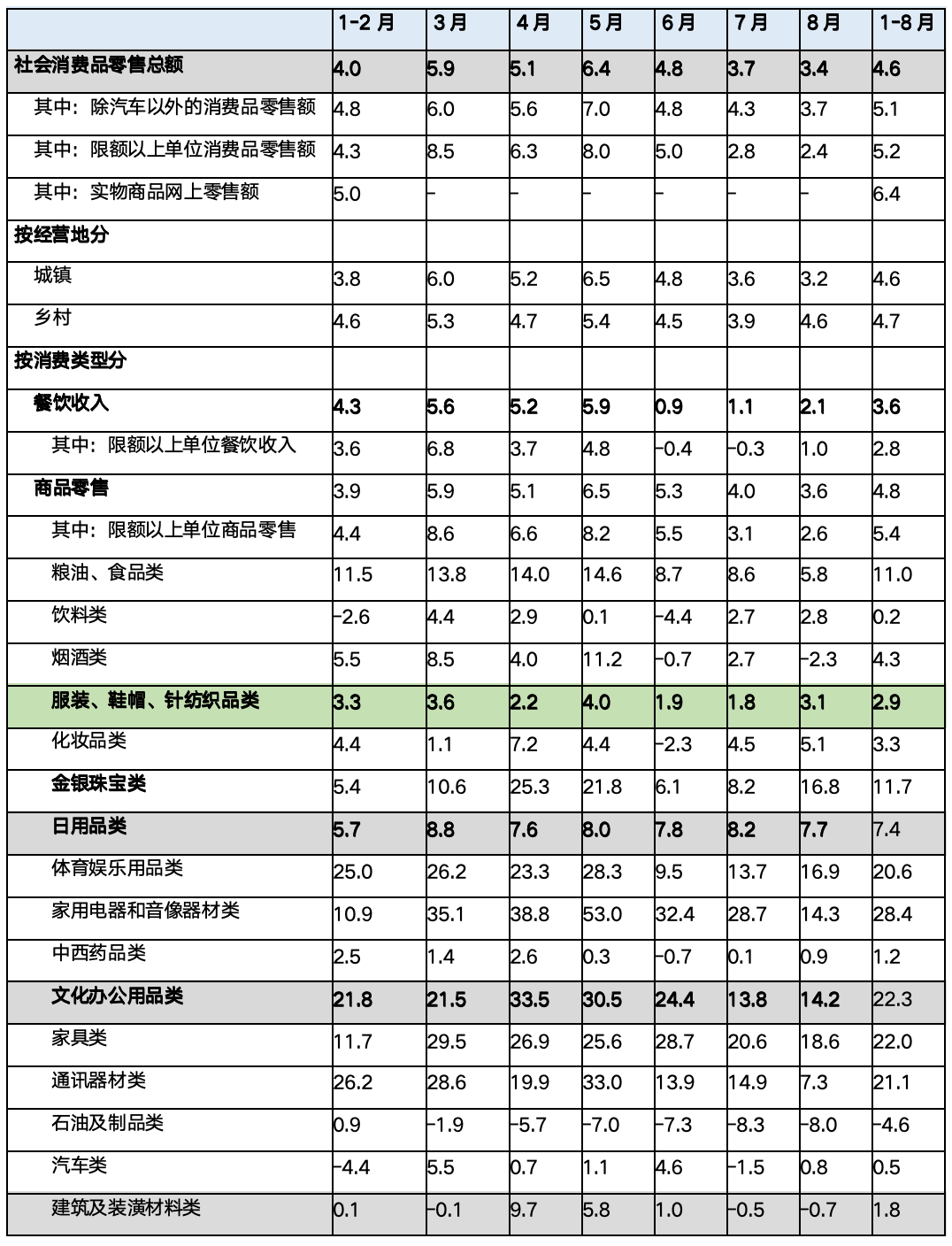 按消费类型分,8月份,商品零售同比增长3.6%,餐饮收入同比增长2.1%;服装、鞋帽、针纺织品零售额同比增长3.1%。