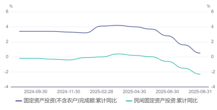(2)投资:1-8月份固定资产投资同比增长0.5%,增速已连续5个月放缓