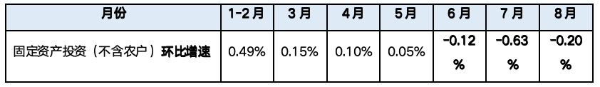 1-8月份,全国固定资产投资(不含农户)同比增长0.5%,其中,民间固定资产投资同比下降2.3%(降幅较1-7月扩大0.8个百分点),外商投资企业投资同比下降15.4%。8月份固定资产投资(不含农户)环比下降0.20%。