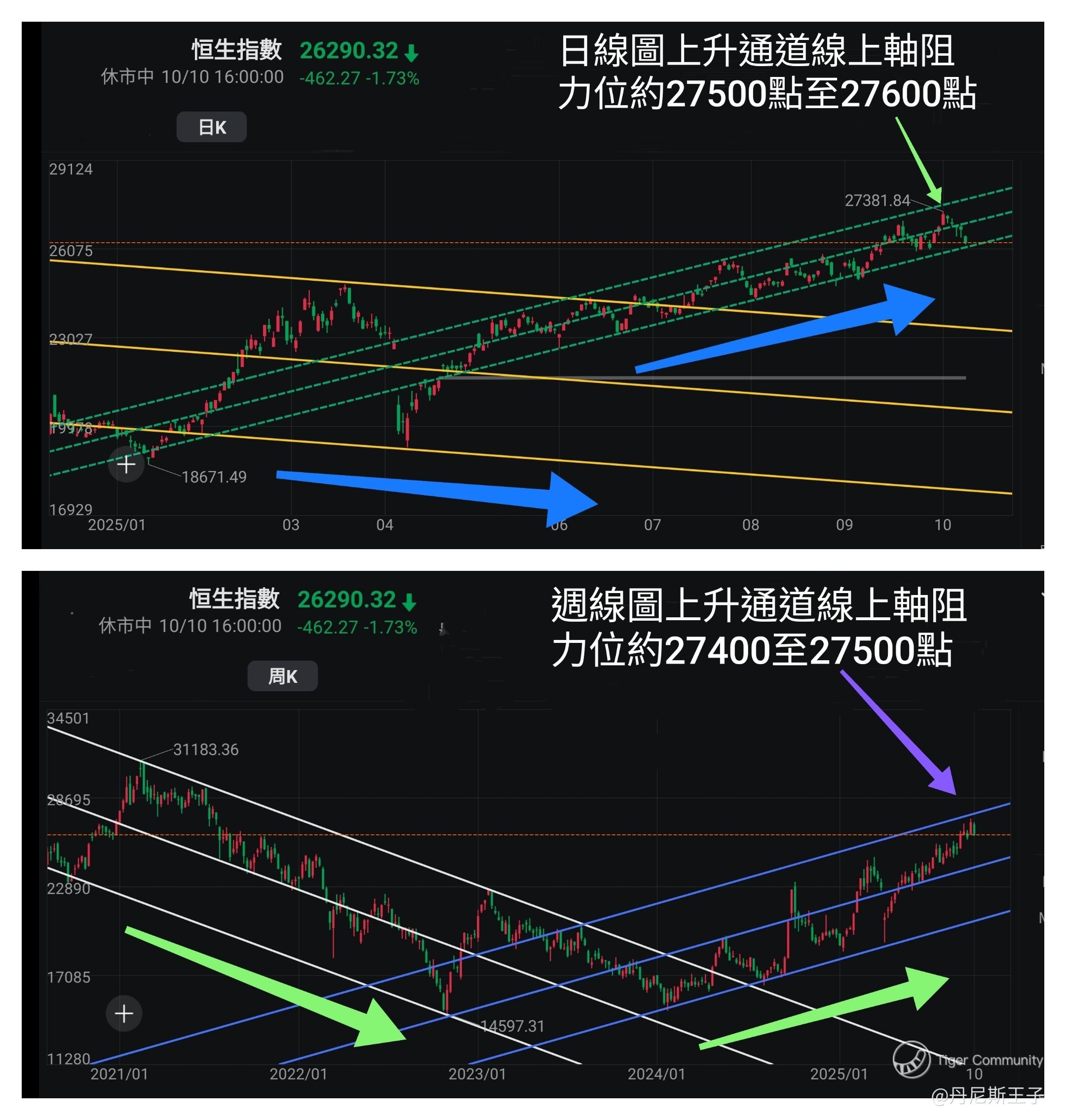 从通道线图所见,恒生指数于10月2日升近日线图和周线图上升通道线图上轴阻力区27400点至27600点。