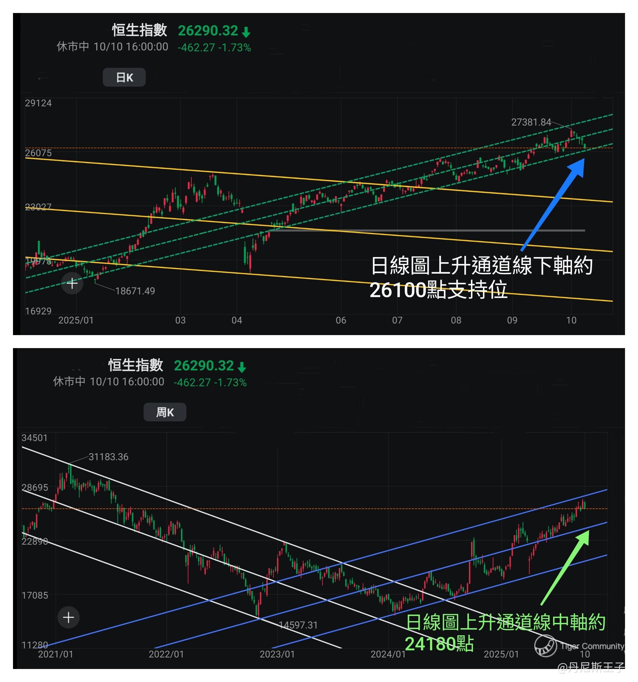 运用通道线图及移动平均线去判断恒生指数下方支持位: