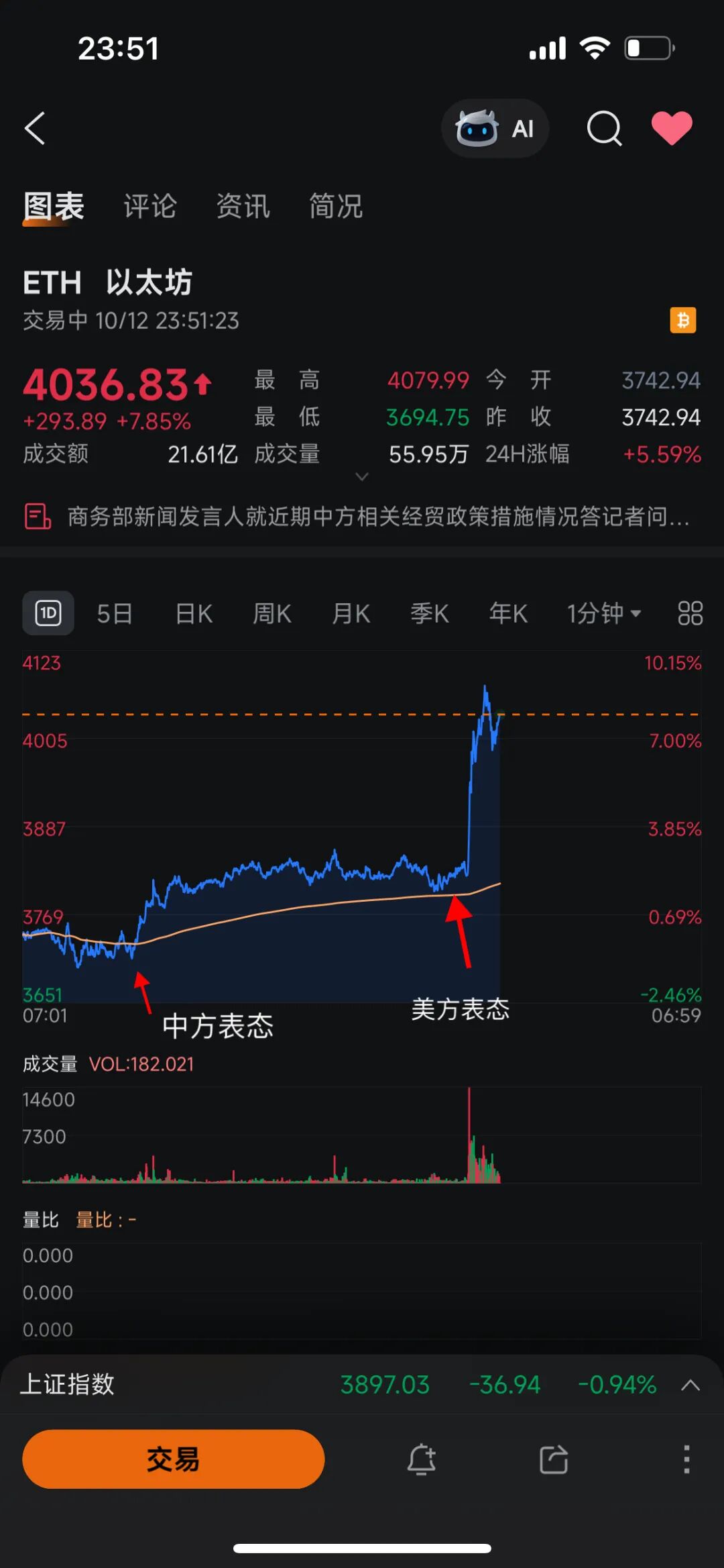 在美国万斯针对中美这次贸易升级表态后,24小时交易的虚拟币迎来大幅反弹,以太坊直线拉升五六个点,目前涨幅7.85%!