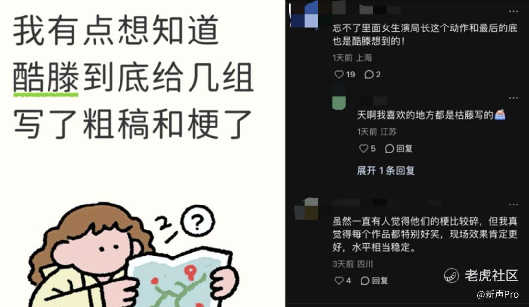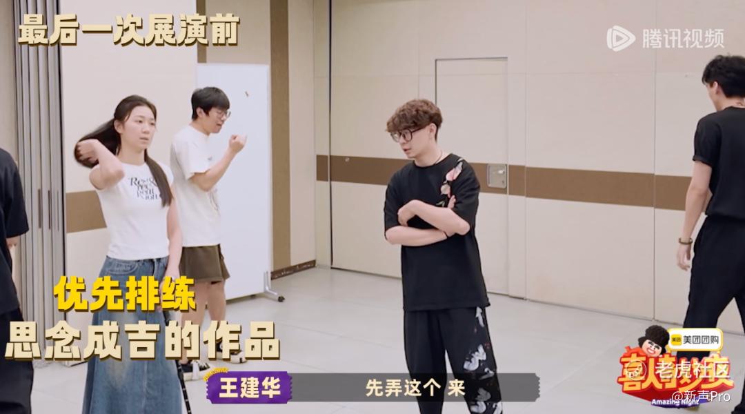 而在台下,这些有经验的选手们能为作品创作提供许多新鲜的视角。有看了花絮的观众在小红书感慨:酷滕在第一赛段到底给几组写了粗稿和梗了?有人在评论区补充:《忘不了》中李梓溪演局长的动作和最后的底也是酷滕想的。刘胜瑛所在小队的《那天,我在楼顶》前期展演不顺,他们的创作房间就成了喜人的「观光景点」,想来帮忙的人络绎不绝。先是高超高越来帮他想梗,再是蒋易带着昆丁实验室编剧全员都来到创排间,李飞、高颖也陆续来帮忙。