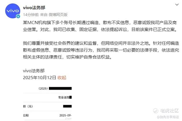 10月12日,@vivo法务部 发文,某MCN机构旗下多个账号长期通过编造、散布不实信息,恶意诋毁vivo品及商业信誉。对此,vivo已收集、固定证据,依法提起诉讼,目前该案件已正式立案。(每经网)